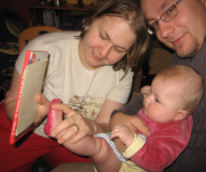 Wieder so ein Brauch der Großen: Mama und Papa erstellen Weihnachtskarten. Ich darf dafür meinen Fuß zur Verfügung stellen. Der Fuß wird zuerst mit einem Pinsel mit Farbe bemalt. Anschliessend wird mein Fuß gegen Papier gedrückt. Eigentlich ist das der Moment, an dem ich nicht zappeln dürfte, damit der Fußabdruck gelingt. Tja, denkste — vorher mich am Fuß kitzeln und dann soll ich auch noch stillhalten? Das lustige an dem ganzen Prozedere ist, dass Mama und Papa von der Farbe auch nicht verschont bleiben. Dafür sorge ich schon.
