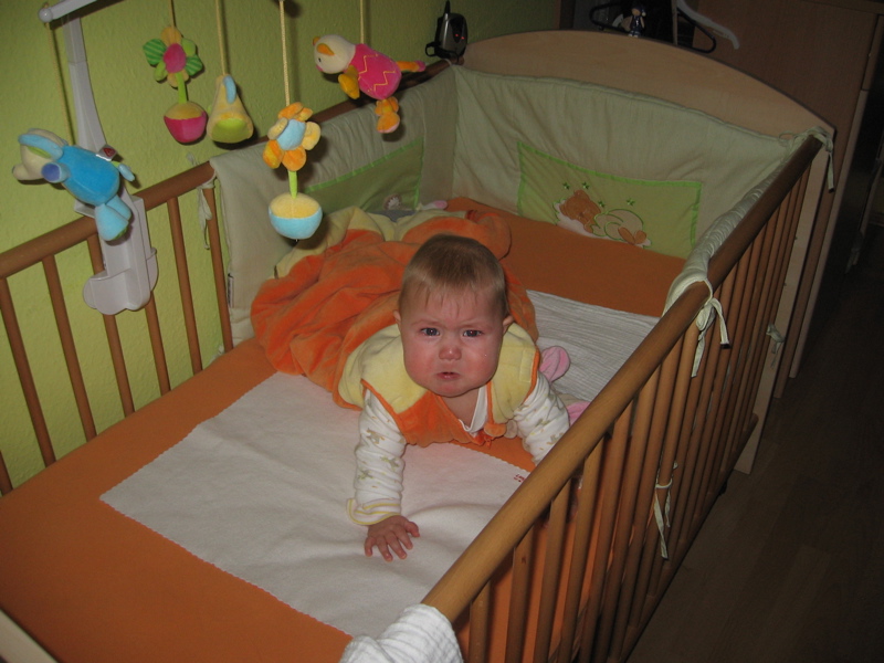 Vorbei sind die Zeiten, in denen ich nur auf dem Rücken lag. Nun dreh ich mich auch im Schlaf. Zu meiner Überraschung wache ich manchmal mitten in der Nacht auf dem Bauch liegend auf … Vor lauter Schreck weine ich dann, so dass Mama oder Papa kommen müssen, um mich wieder in Schlafposition zu bringen.