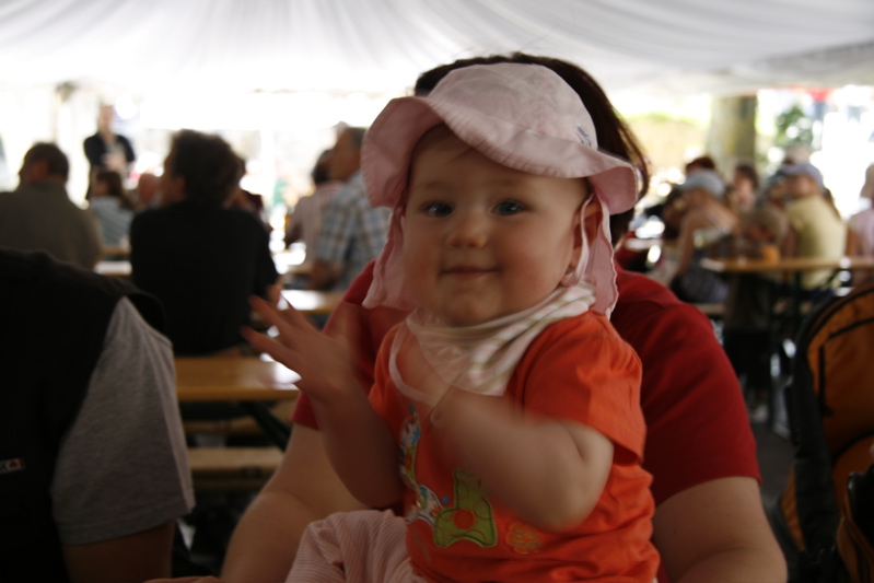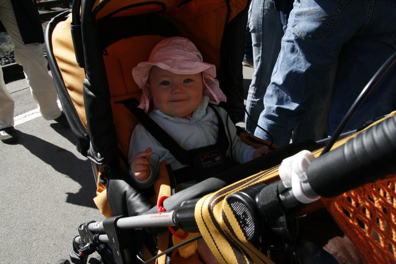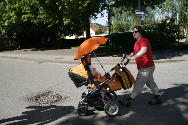 Tja, so mussten die beiden abwechselnd mich und meinen Wagen den Berg nach oben schieben. Ich hab es mir derweil bequem gemacht und die beiden zusammen mit den anderen Leuten angefeuert. Nach einem wirklich anstrengenden Stück Weg gab es zur Belohnung auch mal ein Lächeln von mir. Auf den letzten 100 Metern gab es sogar noch Unterstützung für Mama und Papa, die beide schon wirklich sehr fertig ausgesehen haben.