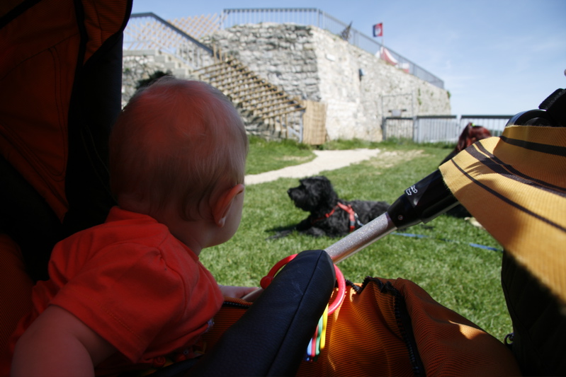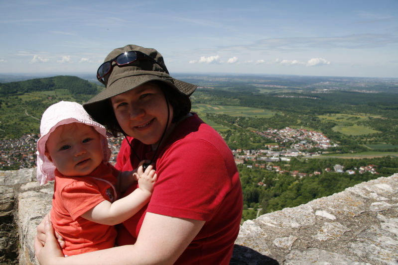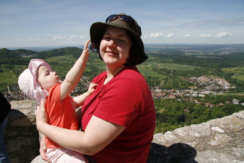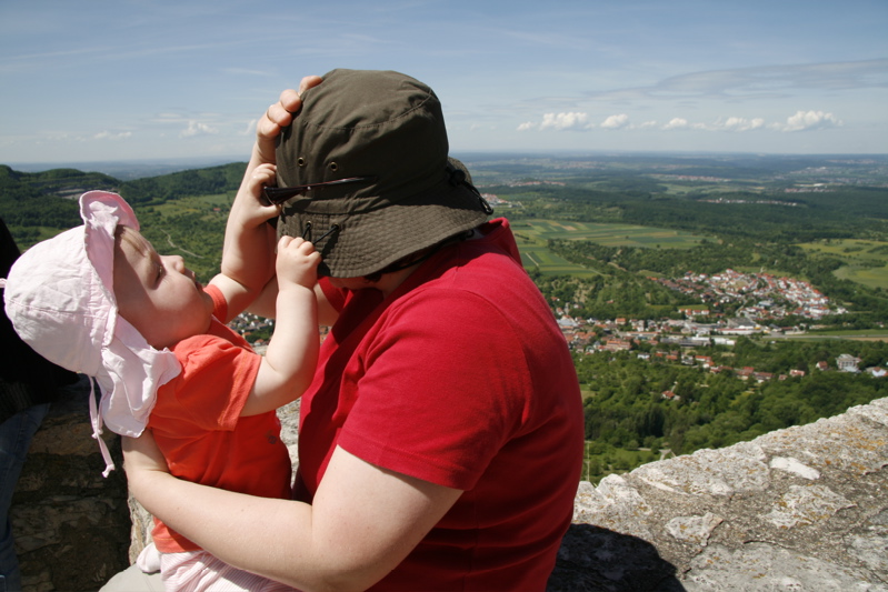 Naja, jeder Berg hat eine Spitze … und auf unserem befand sich hoch oben das ersehnte Ziel … die Burg Hohen Neuffen. Von dort oben hat man echt eine super Aussicht. Wobei, viel interessanter fand ich ja, was Mama so auf dem Kopf trug. Hab ich schonmal erwähnt, dass ich Brillen jeglicher Art total interessant finde …