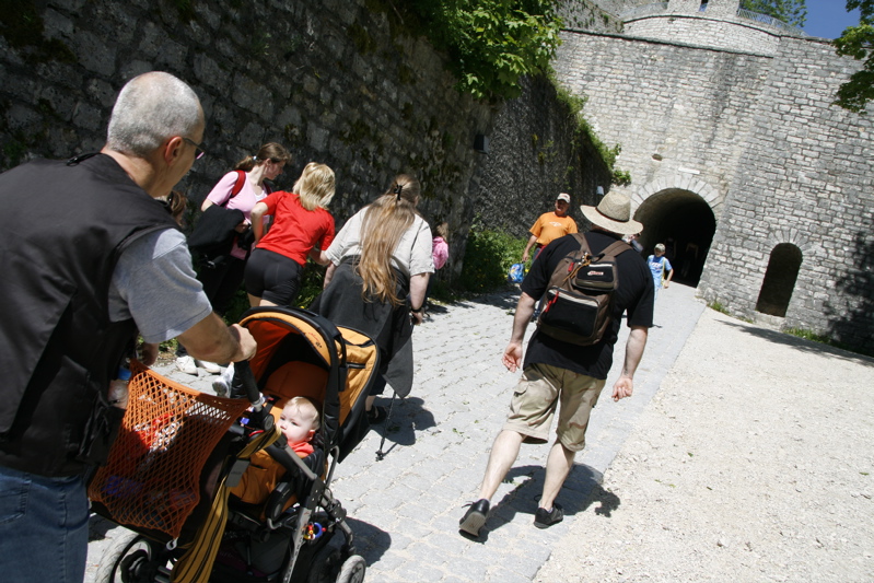 Nachdem mein Rennwagen aus dem Gepäckwagen entladen war, ging es weiter mit Teil 2 … auf Richtung Burg Hohen Neuffen. Tja, und wie der Name schon verrät, hat man die Burg nicht in einem Tal errichtet. Es ging bergauf, und das nicht nur für ein paar Schritte. Wieviele es genau waren, kann ich dir nicht sagen … ich kann ja noch nicht laufen! Zum Glück, sonst wären Mama und Papa bestimmt noch auf die Idee gekommen mich meinen Rennwagen alleine schieben zu lassen.