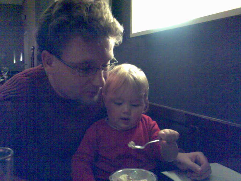 Ich wollte davon nichts haben, musste dafür aber Papa Löffel für Löffel füttern. Hab ich natürlich gern gemacht. So im Nachhinein beschleicht mich aber das dumme Gefühl, dass er nur nicht mit mir zwischen den Tischen laufen wollte …