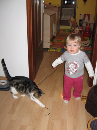 Ich habe eine neue Beschäftigung entdeckt: Spielen mit Tiger und Sweety. Das geht ganz einfach und macht ne Menge Spaß. Alles was ich dazu brauche ist eine Schnur … und schon folgt mir Tiger durch die ganze Wohnung. Achja, passend dazu rufen ich die ganze Zeit ihren Namen: „Tiger“.