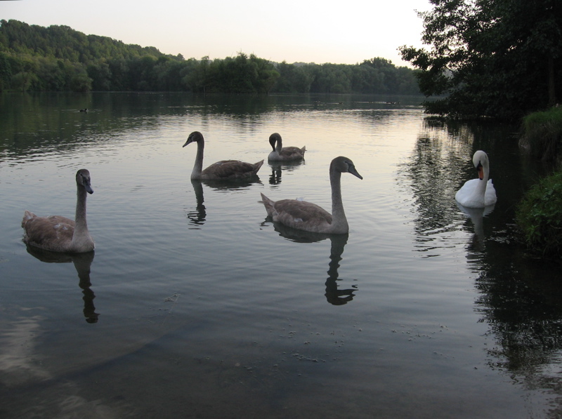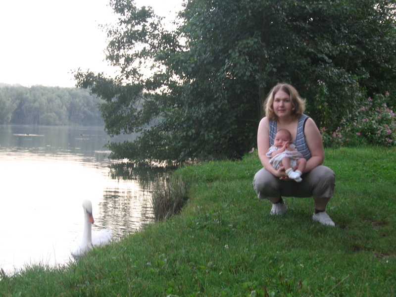 Warum der Baggersee so heißt, weiß ich auch nicht — Bagger habe ich zumindestens keine gesehen. Nur solche Dinger in grau und weiß sind auf dem Wasser geschwommen. Die haben einen so langen Hals, genauso wie die Giraffe von meinem Schnullerhalter (den haben mir übrigends Katja und Bianca geschenkt). Mama meinte, dass seien Schwäne — und vor denen müsste man sich in Acht nehmen. Das war wohl auch der Grund, warum sie mit mir nicht so nah an das Wasser ging, als Papa ein Foto von uns und den Schwänen machen wollte.