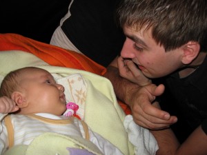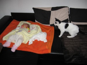 Am Nachmittag habe ich ganz oft Katja und Bianca gesehen. Zusammen waren wir draußen eine Runde spazieren. Nach einer Stärkung mit dem Fläschchen durch Katja haben wir es uns gemeinsam auf der Couch bequem gemacht. Die beiden sind mittlerweile ganz vernarrt in mich und wollten mich gar nicht mehr hergeben, als Mama und Papa mich am Abend wieder abholten. Mir geht es genauso: Ich verstehe mich mit den beiden richtig gut. Wir albern viel herum. So sehr, dass ich lachen muss — was dann Katja und Bianca ganz toll finden. Oder ich erzähle ihnen, was ich so den ganzen Tag erlebe. Heute habe ich den beiden auch gezeigt, wie ich mir schon den Daumen in den Mund stecken kann. Oder am besten gleich die ganze Hand.