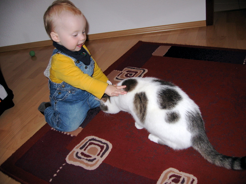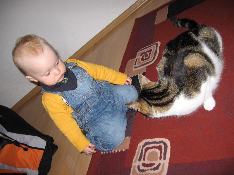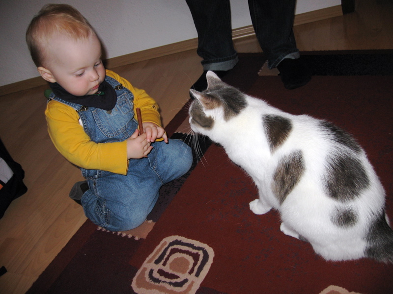 Die beiden Miezis waren übrigends richtig interessiert an meinem Besuch. Mit ein wenig Bestechung hat sich Sweety sogar von Jasmin streicheln lassen. Für eine Stange Leckerli lassen die Beiden eben alles mit sich machen. Wobei Jasmin am liebsten selbst mal von der Stange probiert hätte. Nur haben ihre Eltern ganz genau aufgepasst, was sie damit macht. Na, wenn ich dazu komme, kann ich ihr ja dann erzählen, wie das schmeckt.