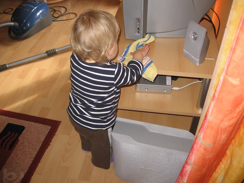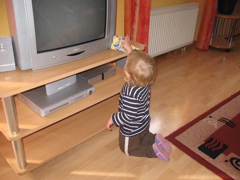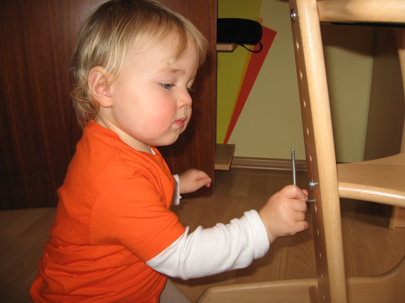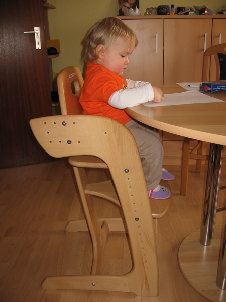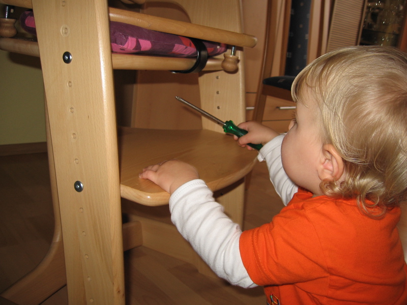 … dann müsst ihr nur zu mir gehn. Heute hab ich zum Beispiel meinen Hochstuhl umgebaut. Das Tischchen musste weg, damit ich am Frühstückstisch noch leichter an die Sachen von Mama und Papa ran kann.