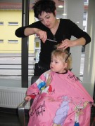 Richtig, ich war heute beim Friseur. Naja, eigentlich war Mama dort. Ich wollte sie nur besuchen. Kaum hatte ich es mir mit einem Keks in der Hand auf dem Stuhl neben Mama bequem gemacht, da hatte ich auch schon diesen Riesenlatz um meinem Hals. Ruckzuck … war die Frau mit der Schere in der Hand an meinem Kopf zugange. So ganz geheuer war mir das nicht, denn ich konnte nicht sehen, was die Frau hinter meinem Rücken alles anstellt. Trotzdem hat sie mich immer wieder gelobt, wie ruhig ich doch sitzen bleibe. Und am Ende finde ich, kann sich das Ergebnis doch sehen lassen.