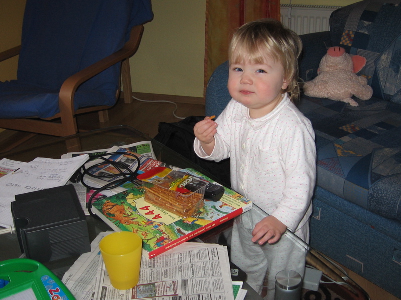 wäre Papa nicht stutzig geworden, weil es auf einmal so ruhig in der Wohnung war. Achja, Salzstangen machen einen Mordsdurst … was für ein Glück, dass ein Becher mit Wasser direkt neben den Salzstangen auf dem Tisch stand. Es geht doch nichts über ein gesundes Frühstück, oder? -