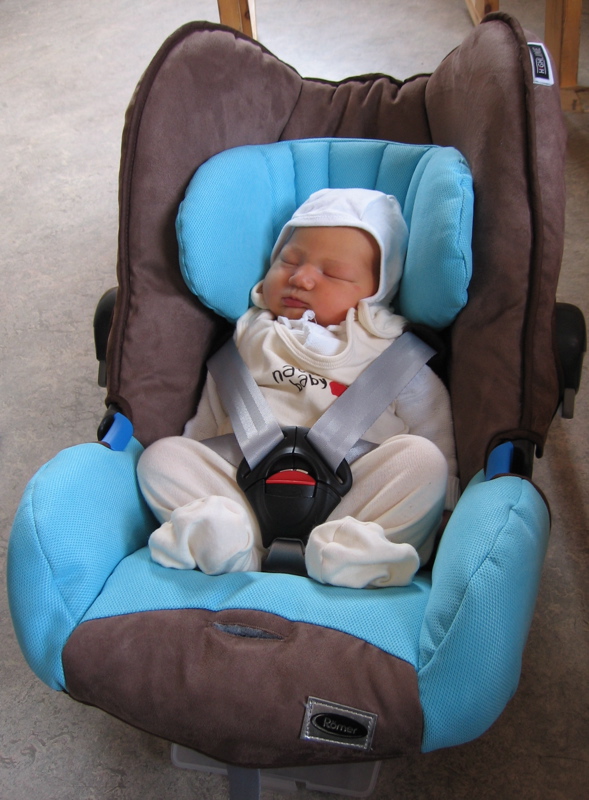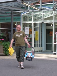 Nach 4 Tagen zusammen mit Mama im Krankenhaus hatten wir auch genug … und wollten endlich nach Hause. Der Papa hatte bereits daheim die Nacht zuvor alles für unsere Ankunft vorbereitet. Das war wohl auch der Grund, warum er dann am nächsten Morgen glatt verschlafen hat. So mussten Mama und ich noch eine Weile warten, bis Papa dann im Krankenhaus aufgetaucht ist. Zum Glück hat sich Papa aber beeilt, und als Überraschung hat er mir einen tollen Rennsessel mitgebracht. -