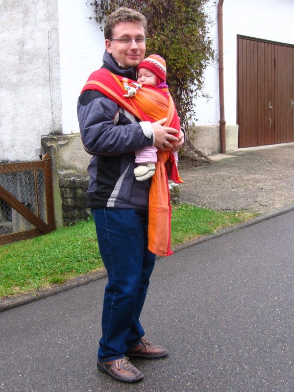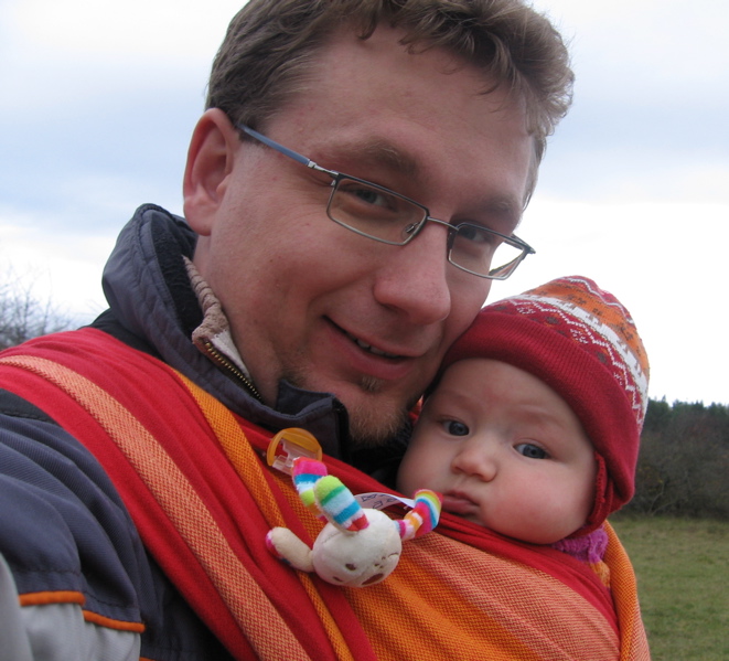 Highlight unseres gemeinsamen Wochenendes war der Spaziergang auf dem Venusberg. Dort hat Papa zum ersten Mal selbst das Tragetuch ausprobiert. Ich bin mir ja noch nicht so ganz sicher, ob das Tragetuch mir gefällt oder nicht.