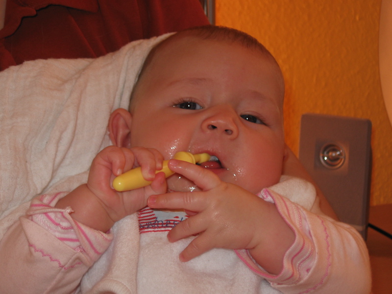 Nein, keine Angst … ich habe noch keine Ahnung, was „Zähne“ sind oder bedeuten. Aber gern in den Mund nehmen tue ich trotzdem schon alles. Deshalb hat mir Mama meine erste Zahnbürste geschenkt …