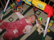 Ich bin Weltmeister … am Babyspielreck. Denn das ist mein neuestes Spielzeug, was ich mit großer Begeisterung nutze. Ob am Morgen oder spät am Nachmittag — mit den vielen bunten Sachen, die da so rumhängen, kann ich richtig viel Krach machen — ob mit Händen oder Füßen. Zum Leid von Mama, aber die hat es ja so gewollt.