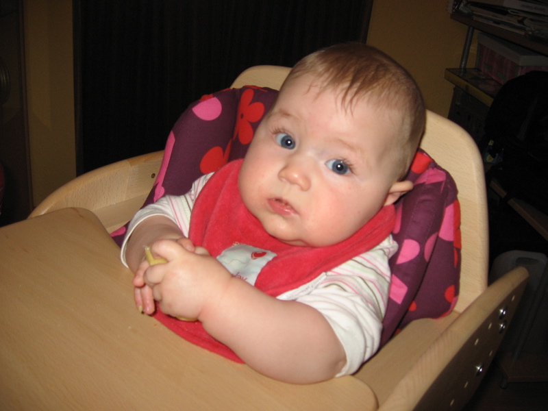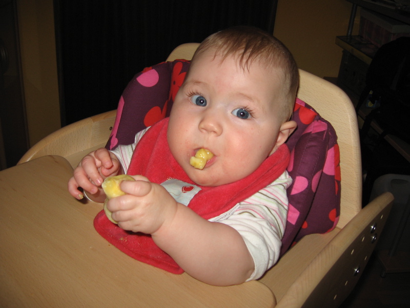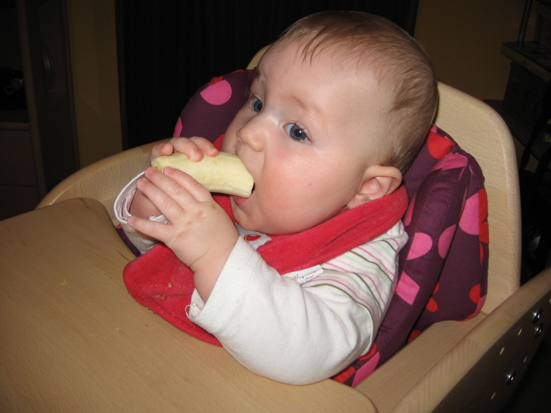 Das erste Stückchen hab ich deshalb nach ein wenig hin-und-herkauen wieder nach draußen befördert. Aber Mama hat mich noch weitere Bissen von der Banane machen lassen, die ich dann auch ohne Probleme mit meiner Zunge kauen und runterschlucken konnte. Lecker.