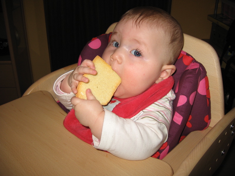 Natürlich hab ich mich nicht nur damit zufrieden gegeben, den beiden beim Futtern zuzusehen. Ich wollte auch etwas zwischen meinen noch auf sich wartenden Zähnen haben. Und was geben mir Mama und Papa da zuerst … Zwieback. Na toll. Soll ich mir jetzt den Zwieback weich „lutschen“? Nachdem Mama erkannt hat, dass das so nichts wird, hat sie mir eine Banane in die Hand gedrückt.