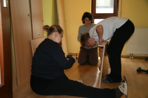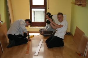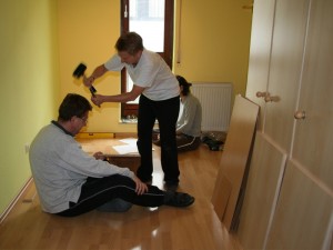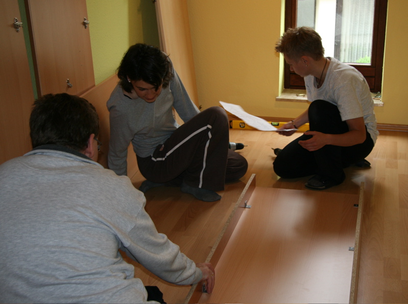 Bei der Einrichtung des Zimmers haben Bianca und Katja — meine beiden Nachbarinnen — sehr viel mitgeholfen. Die beiden haben an einem Tag das ganze Zimmer gestrichen. Für die Auswahl der Farben sind aber Mama und Papa verantwortlich zu machen. Wenn ihr mich fragt, mir gefällt es. Auch beim Aufbau der Möbel haben die beiden Mama und Papa tatkräftig unterstützt, wie die folgenden Bilder beweisen:
