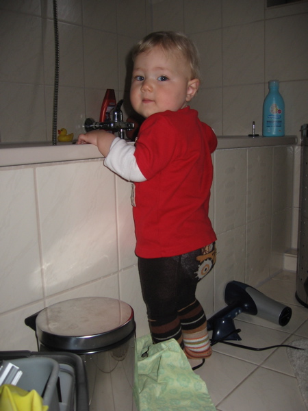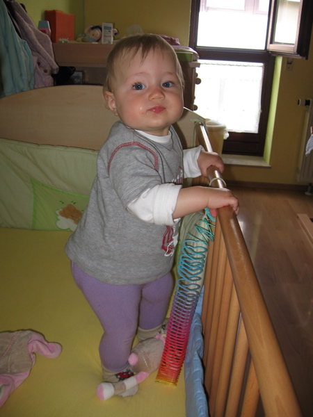 Ich habe langsam Spaß daran gefunden mich an Dingen hochzuziehen und auf meinen eigenen Beinen zu stehen … sei es am Gitter meines Bettes, an der Badewanne, am Couch-Tisch, am Fernseher …