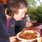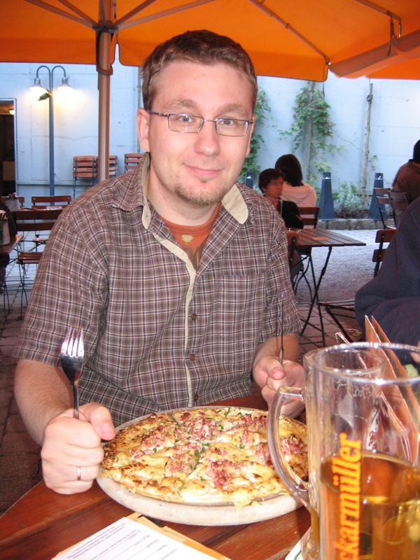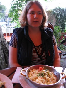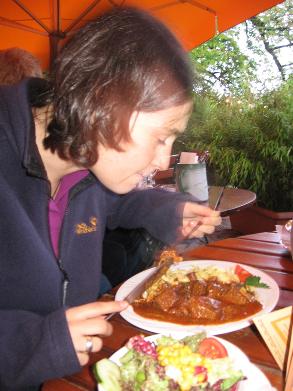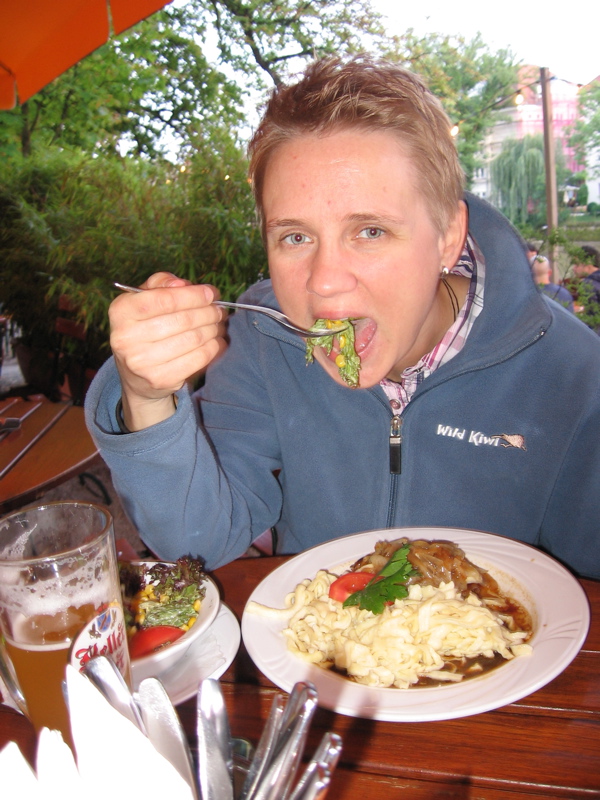 Endlich komplett konnten wir dann auch die Essens-Bestellung aufgeben. Dabei haben wir gelernt, dass unsere Bedienung das Fleisch am liebsten „blutig von der Pfanne küssen lässt“. Das habe ich nicht ganz verstanden, Katja hat sich aber davon nicht abschrecken lassen und trotzdem einen Zwiebelrostbraten bestellt. Wie man auf den Bildern sehen kann, hat es allen geschmeckt.