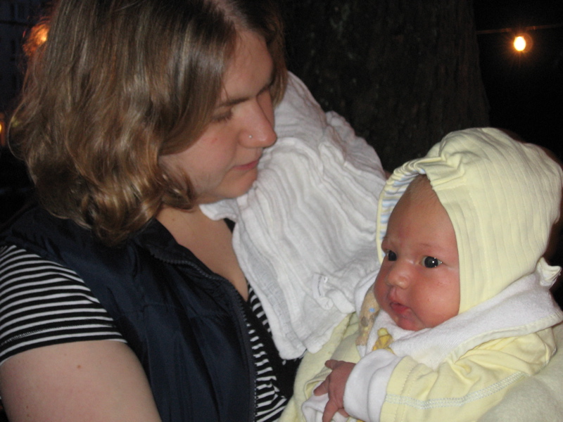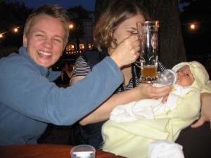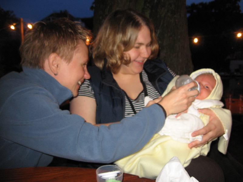 Nachdem die Großen fertig mit essen waren, konnte ich endlich auf mich und meinen Hunger aufmerksam machen. Zum Glück waren Mama und Papa diesmal so schlau gewesen und haben mir meine Portion mit eingepackt. Ehrlich gesagt hätte ich aber lieber etwas von Mama’s Käsespätzle mit Zwiebeln probiert. Aber mich fragt ja keiner … Also habe ich eben mit meinem Fläschchen angestossen. Kurze Zeit später konnte Katja vermelden: „Alles leer“.