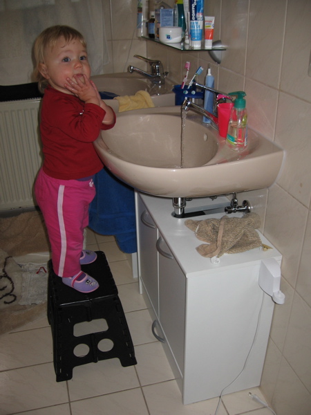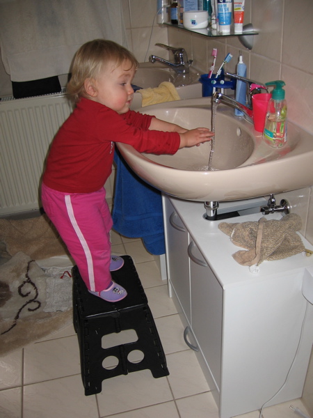 - Vor und nach dem Essen darf ich meine Hände und den Mund waschen. Wo das Waschbecken ist, weiß ich mittlerweile … ich folge einfach den Spuren, welche meine dreckigen Hände an den Glasscheiben und Türen hinterlassen haben.