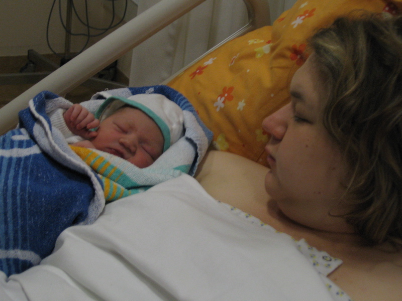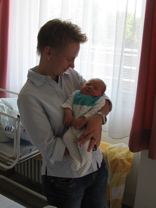 Naja, die nächsten Tage haben Mama und ich dann Kurzurlaub in Tübingen gemacht. Das muss aber eine billige Absteige gewesen sein, denn wir mussten uns das Zimmer teilen. So habe ich die ersten Tage Isabell und anschliessend Justus kennengelernt. Ausserdem wurden Mama und ich die Nacht immer wieder von diesen Hebammen gestört. Und mein Bett war irgendwie auch unbequem. Zum Glück kam Papa nachmittags jeden Tag zum Knuddeln und ist immer so lange geblieben bis ich eingeschlafen bin. Und am Donnerstag kam auch noch Tante Katja zu Besuch. So vergingen die 4 Tage im Krankenhaus wie im Fluge.
