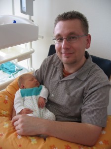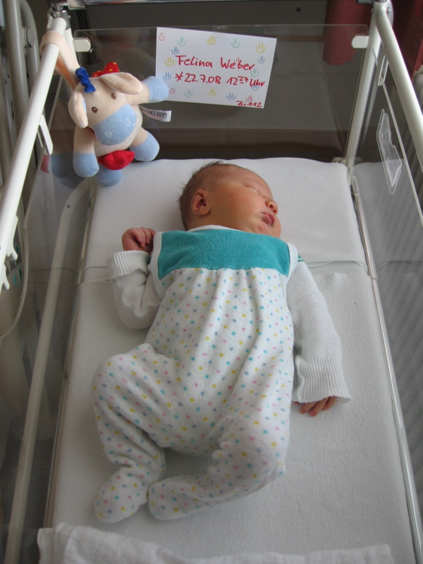 Nachdem mir letzten Dienstag (glaube, dass war der 22.Juli) meine Ein-Zimmer-Wohnung gekündigt wurden ist, habe ich mich erstmal lautstark bei der Hebamme beschwert. Aber irgendwie hat sie sich davon nicht beeindrucken lassen. Und dann habe ich eine vertraute Stimme gehört — Papa war auf einmal neben der Hebamme. Der hat mich dann auch mit ganz viel Knuddeln ganz lieb empfangen. Ich frag mich nur, warum immer so viele zu Papa „Herzlichen Glückwunsch“ gesagt haben … schliesslich hatte man mich gerade aus meiner Wohnung geworfen.