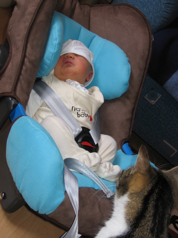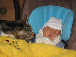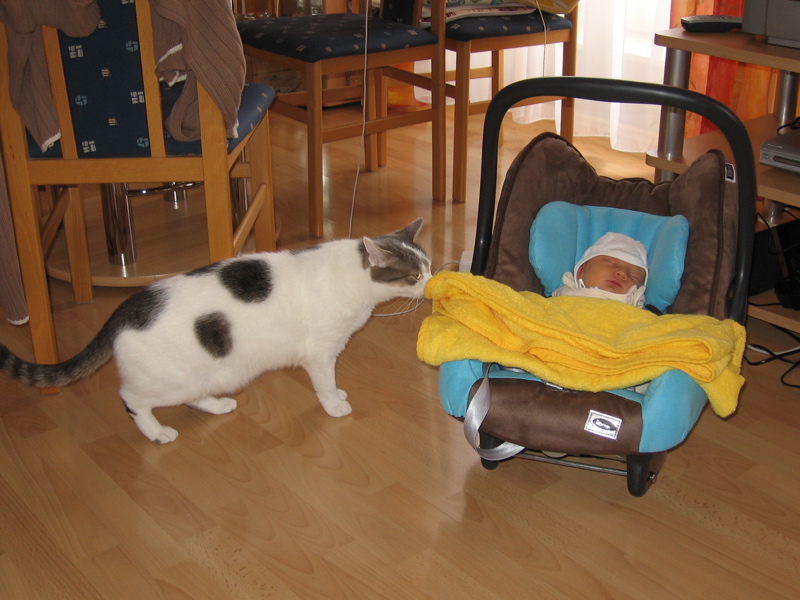 Eine Überaschung gab es dann für mich noch: Meine neue Wohnung ist viiiiieeeeellll größer und geräumiger als meine bisherige Ein-Zimmer-Wohnung. Und ich habe mein eigenes Zimmer. Ich glaube, ich muss Euch auch mal bei Gelegenheit mein Zimmer vorstellen. Aber etwas merkwürdiges habe ich dann noch in meiner neuen Wohnung entdeckt: Da laufen so Dinger rum, die sehen ganz anders aus als die Mama, Papa oder die Hebammen im Krankenhaus. Papa hat mir die beiden Dinger als Tiger und Sweety vorgestellt. Das Interesse von den beiden an mir hält sich aber in Grenzen. Nur mal kurz an mir geschnuppert – das war’s. Die sind momentan mehr an Mama und Papa interessiert als an mir. Aber das wird sich noch ändern, wartet’s ab.