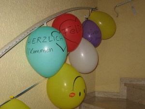Papa’s Fahrstil kenne ich ja schon aus den Zeiten, als ich noch in meiner Ein-Zimmer-Wohnung war. Die Kurvenlage in meinem Rennsessel ist aber auch gut. Daheim angekommen, wurde ich herzlichst willkommen. Im Treppenhaus haben Katja und Bianca Ballons für mich aufgehängt auf denen stand: „Herzlich Willkommen“ – „Felina“ – „Alles Liebe und Glück von Bianca & Katja“.