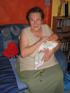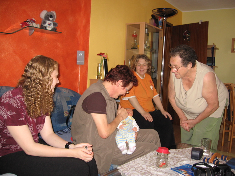Am Sonntag kam dann der nächste Besuch zu mir. Vorgestellt haben die sich mir als Ur-Oma Dora, Oma Sybille, Tante Silke und Tante Evi. Und sie haben mir auch tolle Sachen für meinen Kleiderschrank mitgebracht. Komisch ist nur, dass Mama und Papa immer noch keine Lust zum Kochen hatten, weshalb Oma Sybille die beiden mit Kuchen gefüttert hat. Naja, solange meine Versorgung durch Mama sichergestellt ist, ist alles in Ordnung. Wie ich nachher noch herausbekommen habe, war das sogar der Geburtstagskuchen. Denn Oma Sybille hatte an dem Tag auch Geburtstag. Warum hat mir das denn keiner gesagt, dann hätte ich auch mein schönstes Kleidchen angezogen. Dann hole ich das eben nächstes Jahr nach zum ihrem 50igsten.