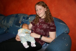 Unter anderem haben mir die beiden von ihrem Urlaub aus Neuseeland eine Schäfchenjacke und Schühchen aus Schafswolle mitgebracht. Da Mama und Papa an dem Tag nur Augen für mich hatten und daher die Lust etwas zu kochen gering war, haben Bianca und Katja das Füttern der beiden für diesen Abend übernommen. Es gab Königsberger Klopse, von welchen ich beim anschliessenden Stillen auch eine Kostprobe erhalten durfte. Und das war richtig lecker. Zum Glück konnte ich in Erfahrung bringen, dass die beiden nur ein Stockwerk direkt über uns wohnen. Falls die Küche bei Mama und Papa mal nichts ordentliches hergibt, werde ich einfach bei den beiden vorbeischauen.