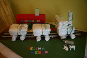 Los ging es gleich am letzten Samstag abend. Da haben sich Bianca und Katja bei mir vorgestellt. Die haben mir einen Zug aus Windeln und vielen anderen nützlichen Utensilien mitgebracht. Ausserdem habe ich viele schöne Sachen zum anziehen bekommen.