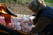 Vor der Fütterung stand aber noch die Beseitigung der „schlechten Luft“ auf dem Plan. Dumm nur, dass die Organisatoren der Kinderwagen-Rallye es versäumt haben, einen Wickeltisch zur Verfügung zu stellen.