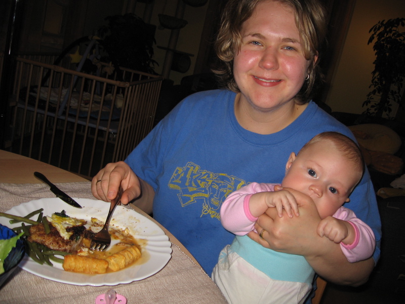 … hat der Papa heute abend gekocht. Neben Mama haben es sich auch Katja und Bianca schmecken lassen. Das sah aber auch lecker aus … Mama wollte mir aber partout nichts von ihrer Portion abgeben. Da habe ich eben kurzerhand ihre Hand verschlungen — wenn sie nur nicht so groß wäre.